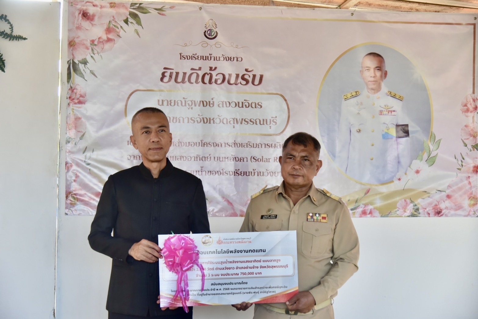 ในการนี้ได้รับเกียรติจาก นายณัฐพงษ์ สงวนจิตร ผู้ว่าราชการจังหวัดสุพรรณบุรี เป็นประธานในพิธีส่งมอบ และนายสิทธิชัย ณ นคร พลังงานจังหวัดสุพรรณบุรี เป็นผู้กล่าวรายงานวัตถุประสงค์ของโครงการฯ พร้อมด้วย นายวรัตม์ มาประณีต รองผู้ว่าราชการจังหวัดสุพรรณบุรี นายกัมปนาท กลิ่นเสาวคนธ์ปลัดจังหวัดสุพรรณบุรี หัวหน้าส่วนราชการ นายอำเภอ ผู้บริหารอปท. อบต. ผู้อำนวยการโรงเรียนวังยาวคณะครู นักเรียน และประชาชนในพื้นที่เข้าร่วม